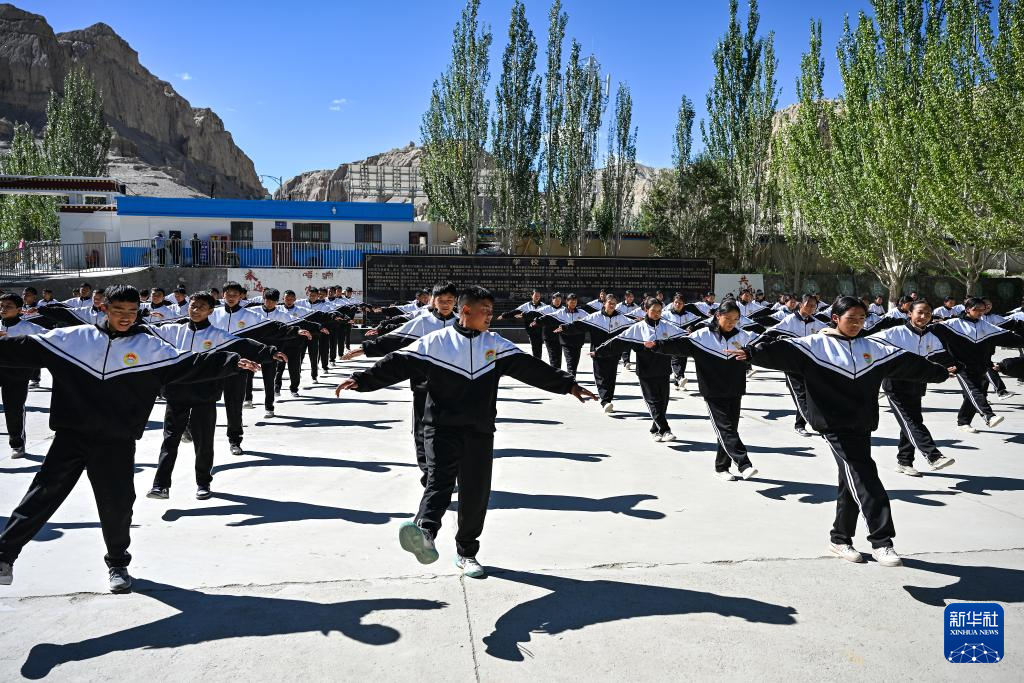 在西藏阿里地區(qū)札達(dá)縣九年一貫制學(xué)校,學(xué)生們跳起融入“宣舞”特色的課間操(9月10日攝)。