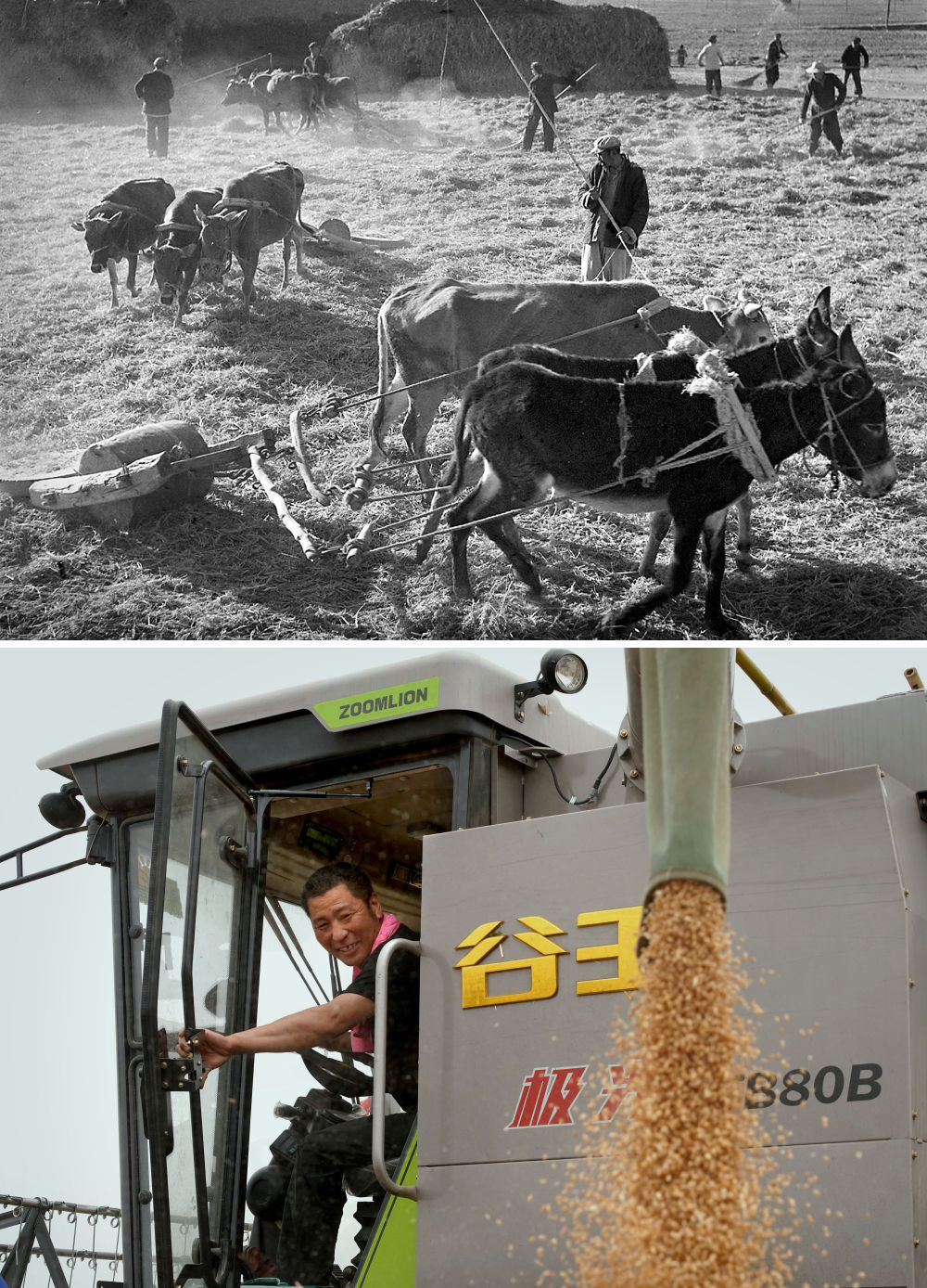 拼版照片:上圖為1965年,河南林縣(現(xiàn)林州市)上陶大隊(duì)第四生產(chǎn)隊(duì)的社員在碾麥打場(新華社記者 楊丙文 攝);下圖為2020年5月29日,在河南商水南陵村的一處麥田里,一位“麥客”將收割脫粒后的小麥直接裝車(新華社記者 李安 攝)。