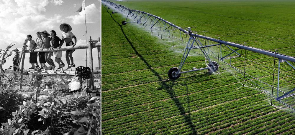 拼版照片:左圖為20世紀(jì)50年代,河南郾城萬金公社社員在踩水車澆田(魏德忠 攝);右圖為2017年3月9日,在河南??h王莊鎮(zhèn)一處麥田里,自走式智能噴灌機(jī)在進(jìn)行噴灌作業(yè)(新華社記者 李安 攝)。