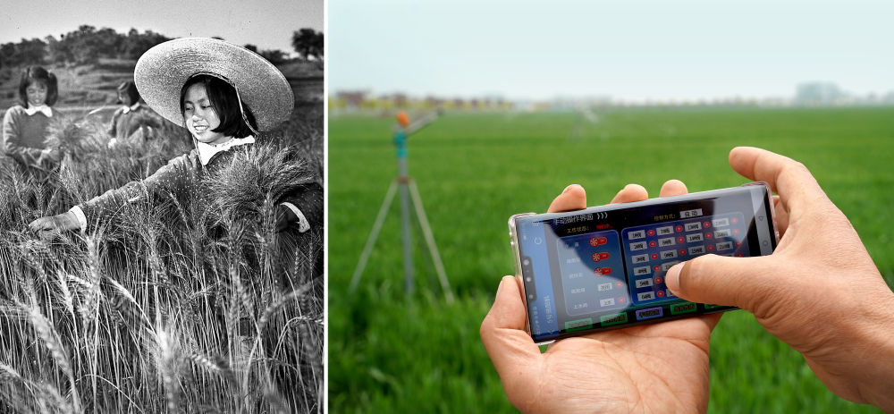 拼版照片:左圖為1961年,河南新縣陡山河鄉(xiāng)的技術(shù)員在進(jìn)行田間調(diào)查,確定小麥選種地塊(新華社記者 張青云 攝);右圖為2021年4月14日,在河南商水一處高標(biāo)準(zhǔn)農(nóng)田里,種糧大戶邱守先使用手機(jī)操控設(shè)備對(duì)小麥田進(jìn)行自動(dòng)噴灌(新華社記者 李安 攝)。