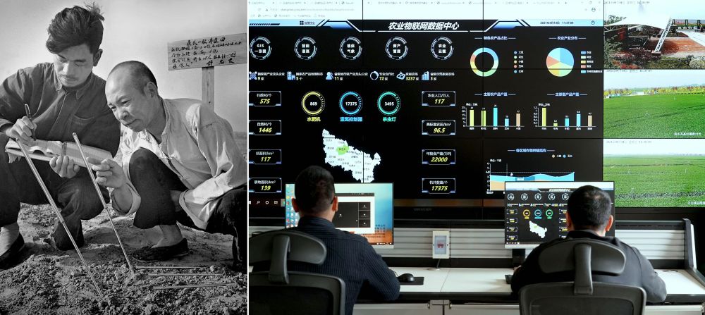 拼版照片:左圖為20世紀(jì)50年代,河南滎陽廣武農(nóng)業(yè)社社員在測(cè)量、記錄地溫(謝延華 攝);右圖為2021年4月14日,工作人員在河南商水農(nóng)業(yè)物聯(lián)網(wǎng)控制中心內(nèi)工作(新華社記者 李安 攝)。