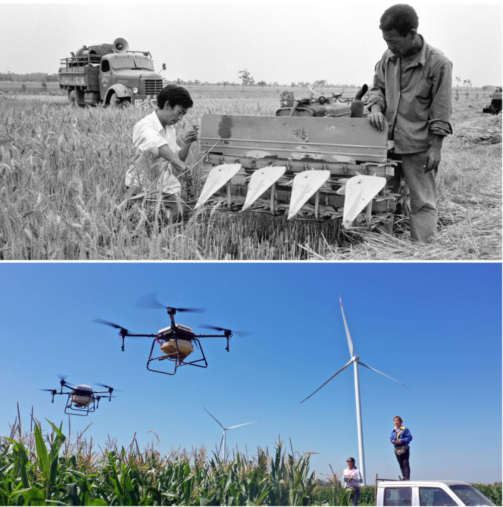 拼版照片:上圖為1986年,河南??h農(nóng)機(jī)公司組織服務(wù)隊(duì)走村串鄉(xiāng)義務(wù)修理農(nóng)業(yè)機(jī)械(新華社記者 唐茂林 攝);下圖為2020年9月4日,河南湯陰“精忠飛防大隊(duì)”飛手在操作植保無人機(jī)(新華社記者 李嘉南 攝)。