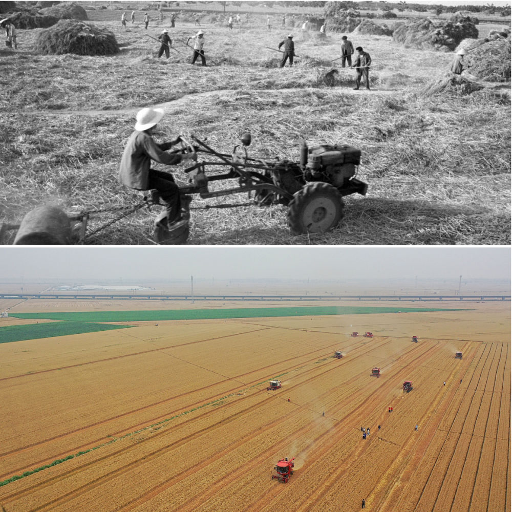 拼版照片:上圖為20世紀(jì)50年代,河南偃師萬畝豐產(chǎn)區(qū)開鐮收割小麥(新華社記者 唐茂林 攝);下圖為2021年6月6日,在河南周口黃泛區(qū)農(nóng)場九分場的麥田里,農(nóng)機(jī)手操作收割機(jī)收獲小麥(新華社記者 李安 攝)。