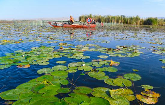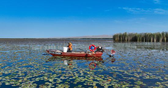 金秋時節(jié),位于新疆維吾爾自治區(qū)巴音郭楞蒙古自治州博湖縣境內(nèi)的博斯騰湖的螃蟹迎來豐收季,波光粼粼的湖面上,穿梭的漁船與蘆葦、睡蓮、沙漠構(gòu)成一幅生動的秋日畫卷。
