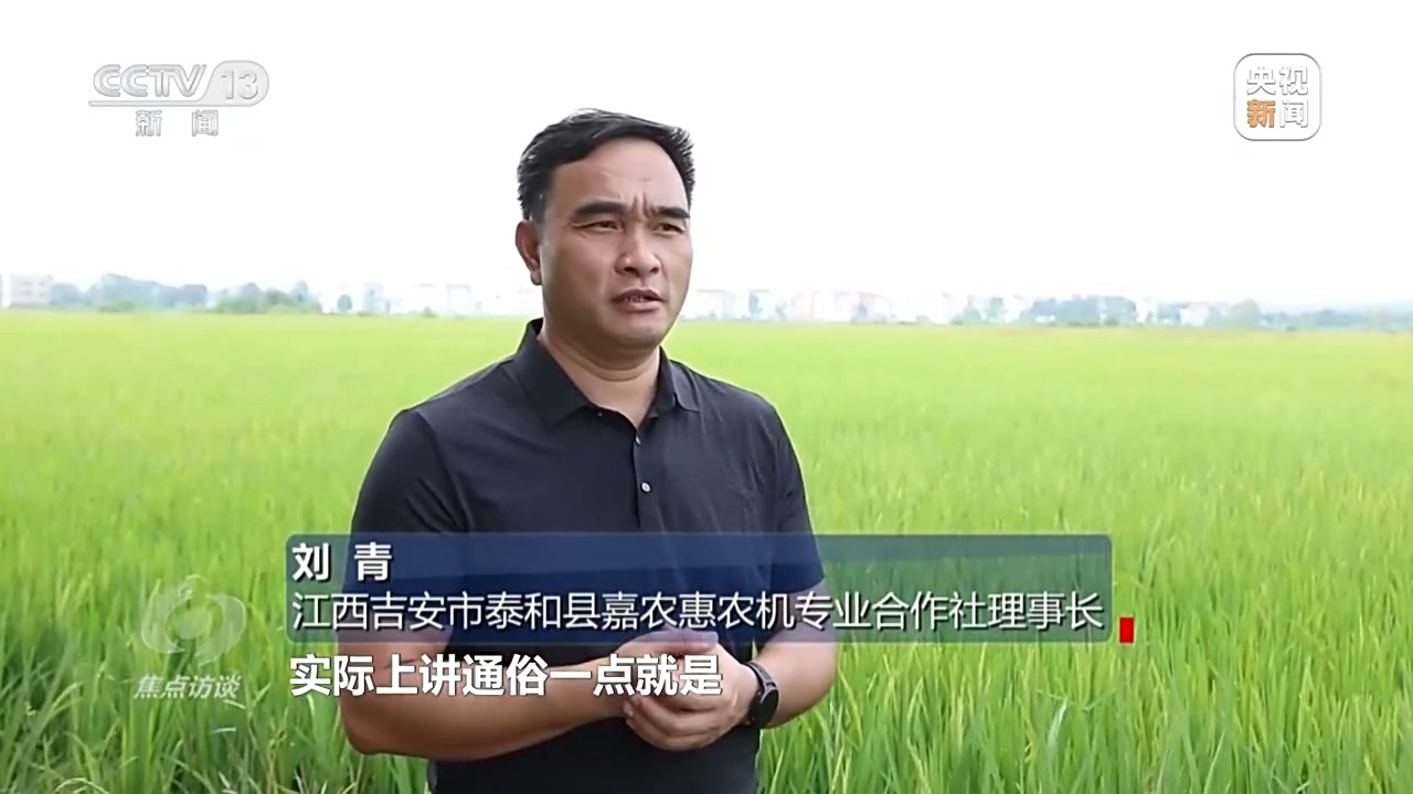 江西吉安市泰和縣嘉農(nóng)惠農(nóng)機專業(yè)合作社理事長 劉青:實際上我們就是農(nóng)民的“田間保姆”,農(nóng)民雇傭我們,我們做他的保姆,為他田里面的稻子種植整個過程,做一個保姆式服務(wù)。