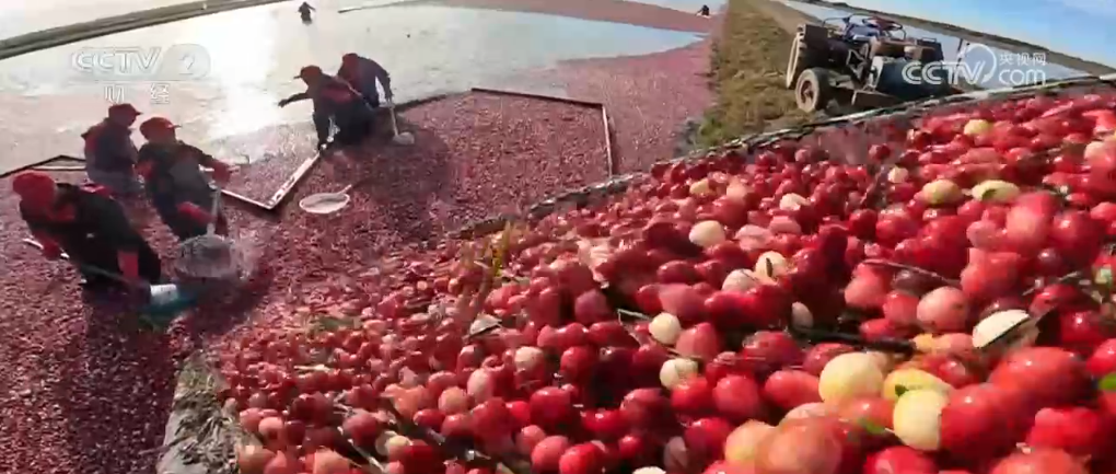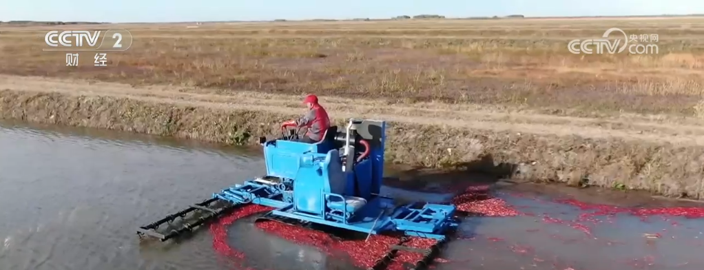 成熟的蔓越莓怎么收獲呢?轉(zhuǎn)過來看這里,這就是記者所說蔓越莓的地塊為什么像池塘,因為這里灌進(jìn)水,工作人員就駕駛著采收機就可以收獲了,采收機上有兩排鋼條,它能將水里的蔓越莓從植株上脫落下來。因為蔓越莓里面是空心的,所以能夠浮在水面上。我們看,采收機走過之后,后面的蔓越莓就漂上來了。工作人員只需要來回多次的行駛,就可以把成熟的果子都收獲下來,這種方式收獲率可以達(dá)到97%以上。每個地塊都這么大,飄在水上的蔓越莓怎么才能收回來呢?工作人員在水里用木板把這些蔓越莓聚攏到一起,再通過提升機就可以裝到車廂里了。每到蔓越莓收獲的季節(jié),田里就變成了紅色的海洋,非常漂亮。