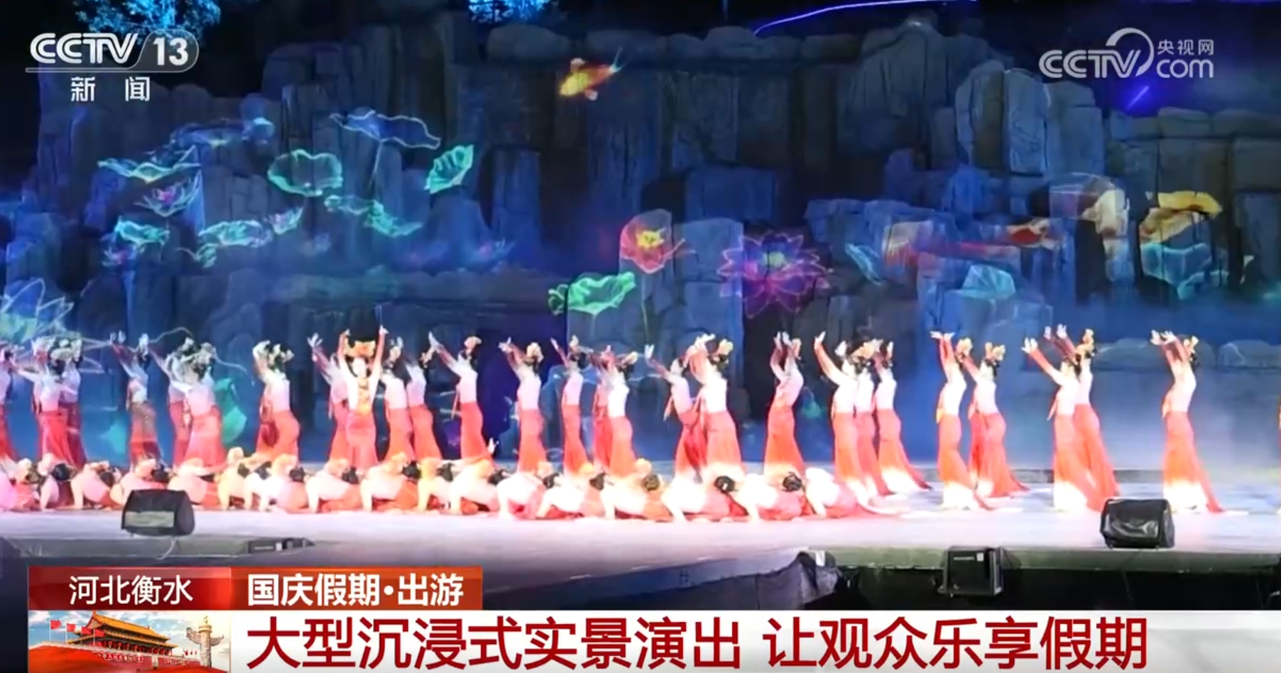 不僅白天能看演出,夜幕降臨后,在河北衡水市,大型沉浸式實(shí)景演出《大美衡水 湖韻千年》精彩上演,主舞臺演出以水為脈,通過音、舞、詩、畫巧妙融合,再加上3D投影等特效技術(shù)的靈活運(yùn)用,營造出強(qiáng)烈的視覺效果和藝術(shù)沖擊力。