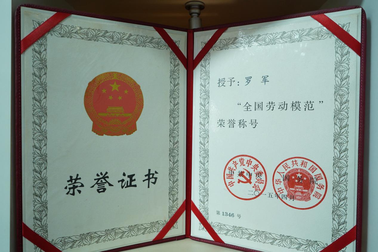 圖為羅軍被授予“全國(guó)勞動(dòng)模范”榮譽(yù)稱號(hào)的證書(shū)。