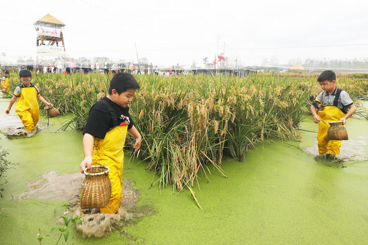 10月3日,孩子們?cè)谡憬×x烏市赤岸鎮(zhèn)一處稻魚共生的稻田里捉魚。