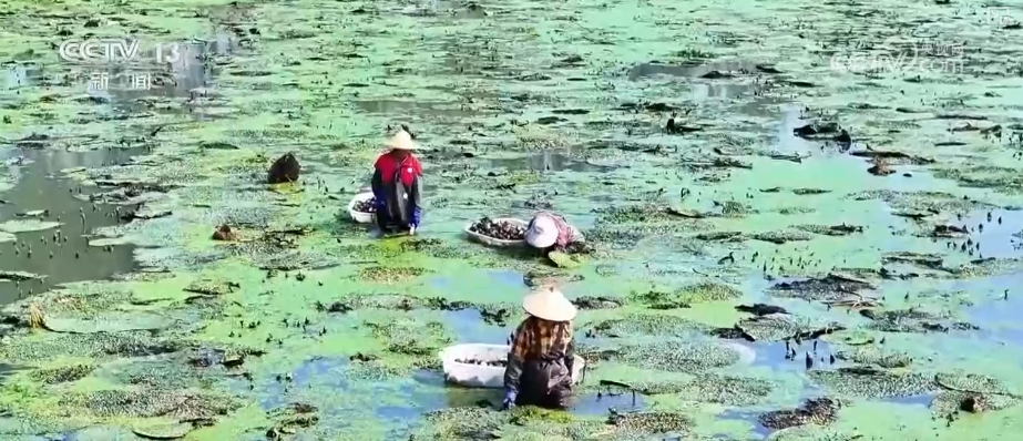 一大早,采摘工人們就來到芡實基地,穿梭在被芡實葉片鋪滿的水塘中,用手中的刀劃開芡實葉,熟練地割下一個個鮮嫩飽滿的芡實果。隨著國慶假期的消費持續(xù)升溫,這幾天當?shù)夭烧と嗣刻斓墓ぷ髁看蠖荚?0個小時左右。