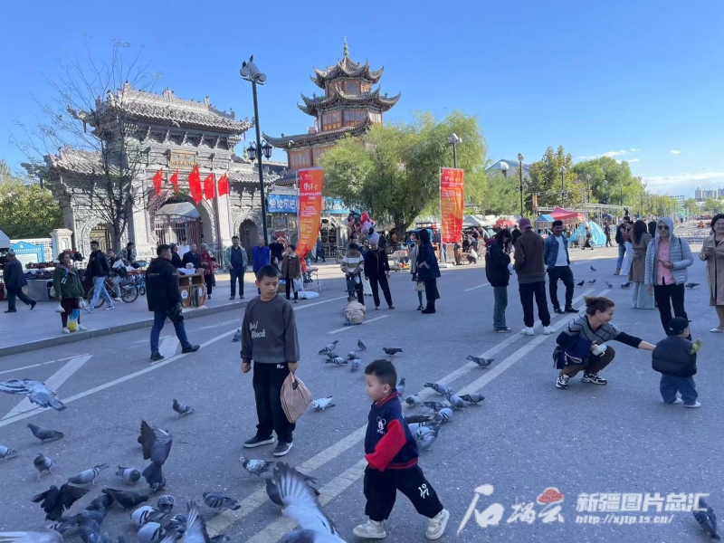 伊寧市喀贊其民俗旅游區(qū)游人與鴿子嬉戲。石榴云/新疆日報記者姚剛攝