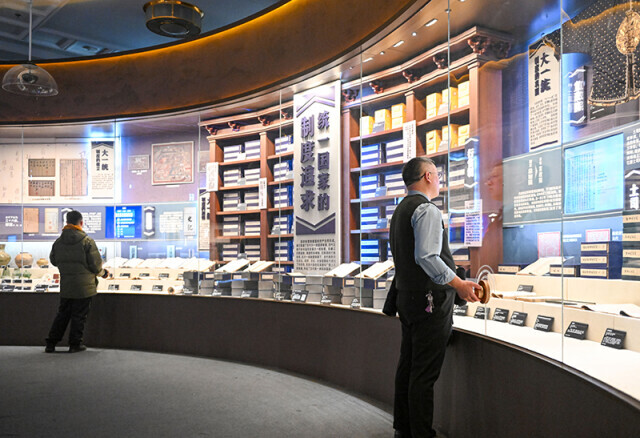 ▲2023年12月23日,參觀者在鑄牢中華民族共同體意識文物古籍展上參觀。展覽分為大一統(tǒng)、大交融、大團結三個單元,共展出1500余件珍貴文物古籍。 新華社記者 郝建偉 攝