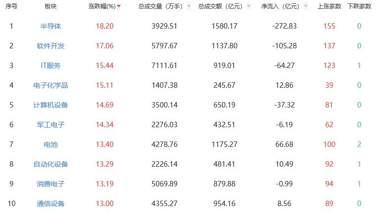 板塊方面,半導(dǎo)體、軟件開發(fā)、IT服務(wù)、電子化學(xué)品、計算機設(shè)備等漲幅居前。