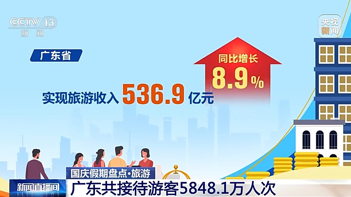 廣東省10月1日至7日累計接待游客5848.1萬人次,按可比口徑同比增長6.2%;實(shí)現(xiàn)旅游收入536.9億元,同比增長8.9%。古驛道沿線重點(diǎn)區(qū)域、紅色旅游經(jīng)典景區(qū)、鄉(xiāng)村旅游點(diǎn)和歷史古村落等,成為旅游出行熱點(diǎn)。