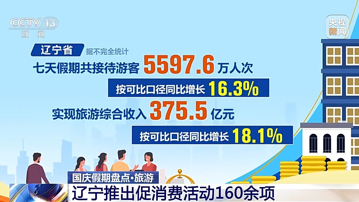 遼寧省據(jù)不完全統(tǒng)計,七天假期共接待游客5597.6萬人次,按可比口徑同比增長16.3%,實(shí)現(xiàn)旅游綜合收入375.5億元,按可比口徑同比增長18.1%。假期里遼寧省推出促消費(fèi)活動160余項(xiàng),全省各地舉辦文化藝術(shù)、群眾文化、非遺、文博等各類活動600余場,通過線上線下聯(lián)動的方式,豐富人們假日文化生活。