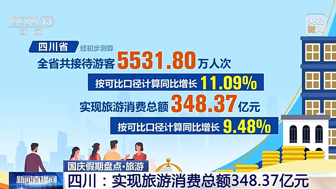 四川省經(jīng)初步測算,全省共接待游客5531.80萬人次,實(shí)現(xiàn)旅游消費(fèi)總額348.37億元,按可比口徑計算,同比分別增長11.09%和9.48%。全省核心旅游景區(qū)“狀態(tài)拉滿”,17家5A級景區(qū)累計接待游客426.93萬人次、實(shí)現(xiàn)門票收入1.85億元,同比分別增長25.06%和15.48%,超越假日歷史最高水平。九寨溝景區(qū)連續(xù)4天均達(dá)4.1萬人承載量上限。
