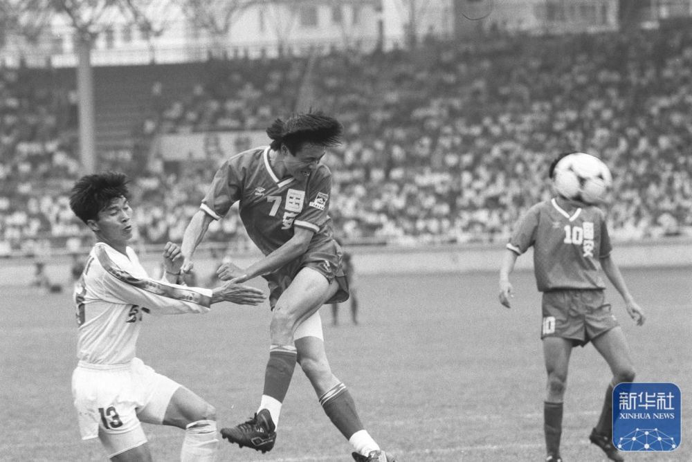 1994是中國足球職業(yè)化改革元年。這是1994年4月17日,全國足球甲級聯(lián)賽全面拉開戰(zhàn)幕。廣東宏遠(yuǎn)俱樂部隊(duì)主場0比2負(fù)于北京國安俱樂部隊(duì),這是國安隊(duì)7號謝峰(中)在頭球攻門。 新華社記者 劉彥武攝