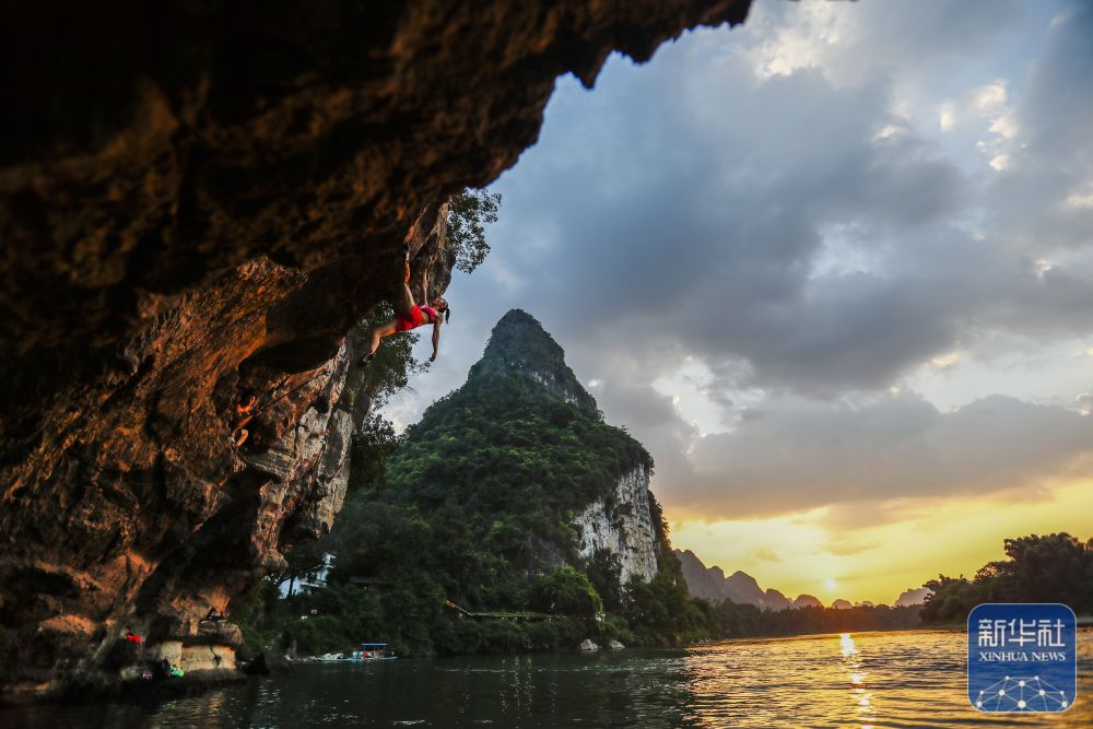 2023年9月5日,攀巖愛好者在廣西桂林市陽朔縣進(jìn)行深水抱石。新華社記者 胡星宇 攝