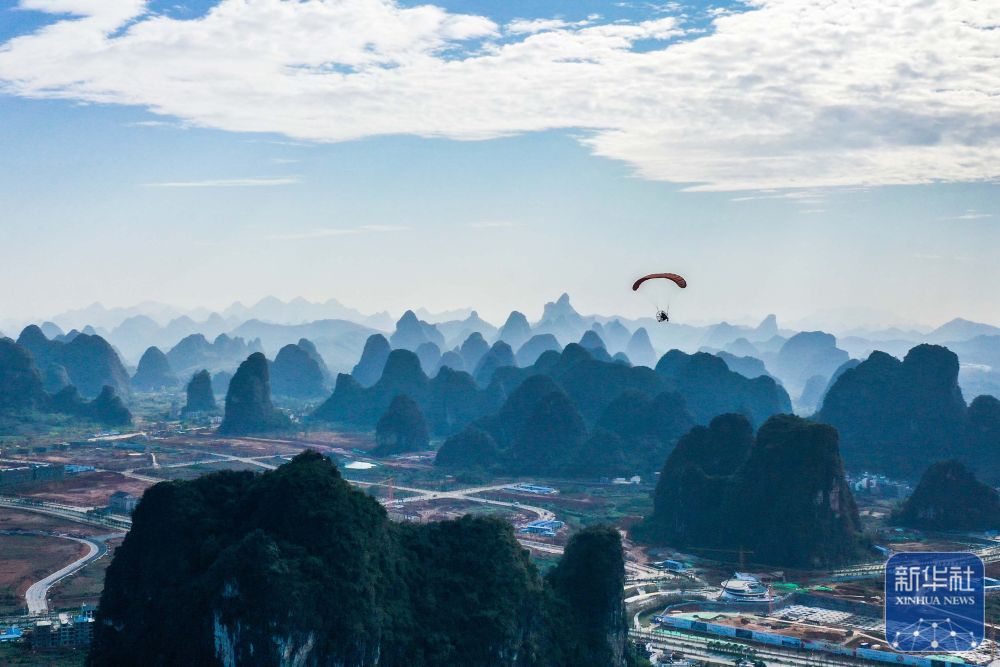 游客在廣西桂林市陽朔縣體驗(yàn)動(dòng)力滑翔傘(2019年11月14日攝,無人機(jī)照片)。 新華社記者 曹祎銘 攝
