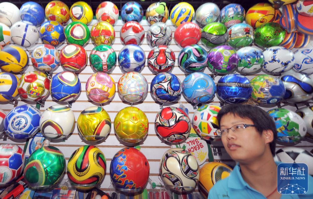 2010年6月23日,一位顧客正在浙江義烏小商品市場內(nèi)選購足球。據(jù)義烏海關(guān)統(tǒng)計(jì),受南非世界杯帶動(dòng),當(dāng)?shù)伢w育用品的月度出口額連續(xù)半年超過1000萬美元,2010年前5個(gè)月的出口額比前一年同期增長110%。 新華社記者 王定昶 攝