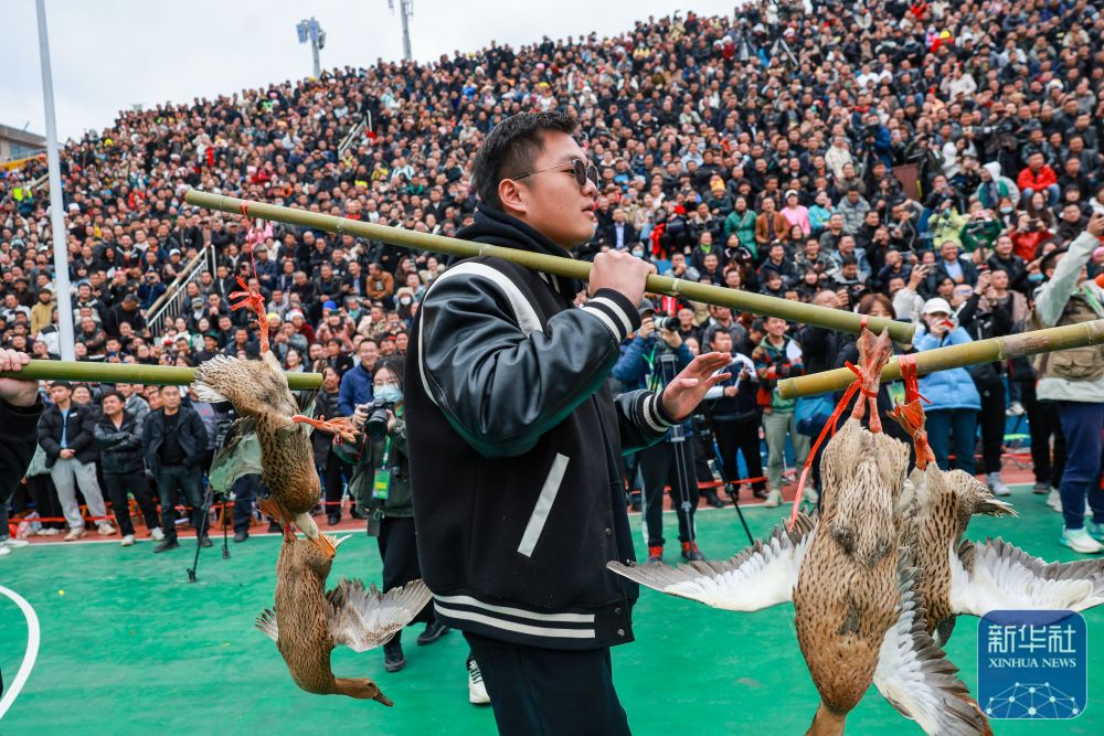 2023年3月27日,村民挑著當(dāng)?shù)剞r(nóng)特產(chǎn)品“三穗麻鴨”進(jìn)入賽場。這是季軍銅仁市代表隊(duì)的獎(jiǎng)品。 當(dāng)日,貴州省首屆“美麗鄉(xiāng)村”籃球聯(lián)賽總決賽在黔東南州臺(tái)江縣臺(tái)盤村舉行。新華社記者 歐東衢 攝