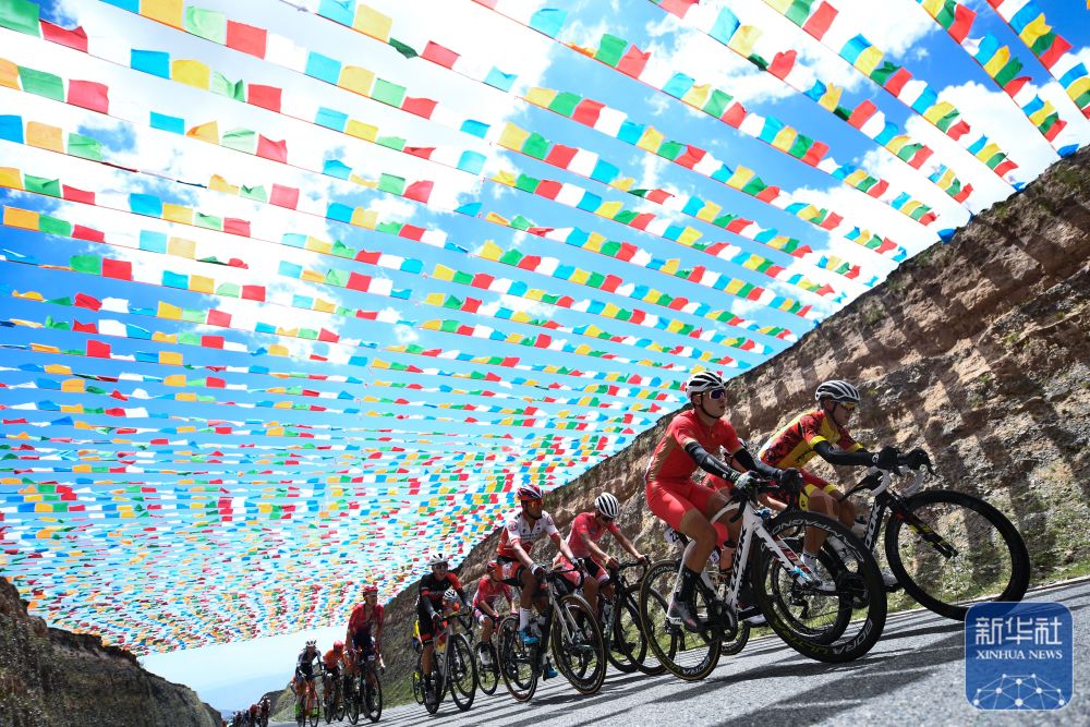 2022年7月29日,參賽選手在比賽中騎行。 當(dāng)日,第二十一屆環(huán)青海湖國際公路自行車賽進(jìn)行了第三賽段貴德至共和的角逐。 新華社記者 張龍 攝
