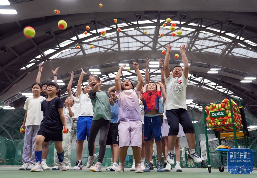 2024年8月14日,在北京一家網(wǎng)球俱樂部,小學(xué)員在結(jié)束網(wǎng)球暑期夏令營的課程后合影。 新華社記者 才揚(yáng) 攝