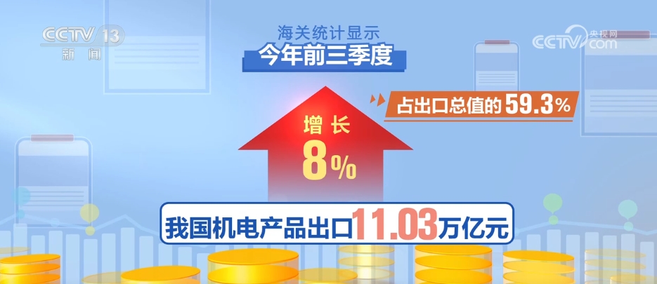 海關(guān)統(tǒng)計顯示,今年前三季度,我國出口產(chǎn)品結(jié)構(gòu)優(yōu)化,高端裝備出口增長超4成。機(jī)電產(chǎn)品出口11.03萬億元,增長8%,占出口總值的59.3%。其中,高端裝備出口增長43.4%,集成電路、汽車、家用電器出口分別增長22%、22.5%、15.5%。此外,傳統(tǒng)勞動密集型產(chǎn)品出口3.13萬億元,增長2.8%。