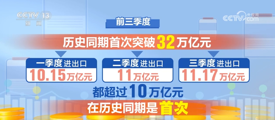 前三季度,歷史同期首次突破32萬(wàn)億元,各季度分別進(jìn)出口10.15萬(wàn)億元、11萬(wàn)億元、11.17萬(wàn)億元,都超過(guò)了10萬(wàn)億元,這在歷史同期也是首次。