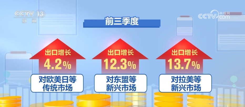需求方面,從國(guó)際看,最新的世貿(mào)組織報(bào)告上調(diào)了對(duì)全年貨物貿(mào)易量增速的預(yù)測(cè),世界銀行、經(jīng)合組織等機(jī)構(gòu)認(rèn)為全球經(jīng)濟(jì)正在企穩(wěn),外需回暖為我國(guó)出口創(chuàng)造了有利條件。前三季度,我國(guó)對(duì)歐美日等傳統(tǒng)市場(chǎng)出口增長(zhǎng)了4.2%,對(duì)東盟、拉美等新興市場(chǎng)出口分別增長(zhǎng)了12.3%、13.7%。