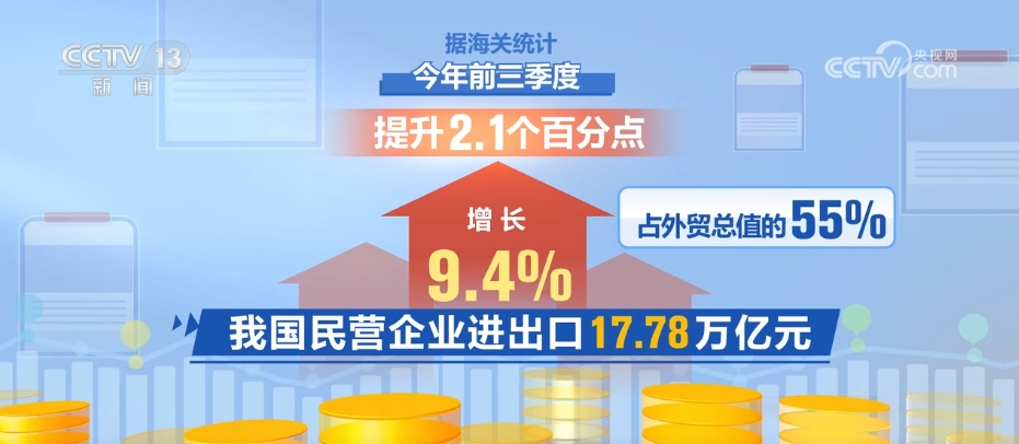 據(jù)海關(guān)統(tǒng)計(jì),今年前三季度,我國(guó)民營(yíng)企業(yè)進(jìn)出口17.78萬(wàn)億元,增長(zhǎng)9.4%,占外貿(mào)總值的55%,提升2.1個(gè)百分點(diǎn);外商投資企業(yè)進(jìn)出口9.53萬(wàn)億元,增長(zhǎng)1.1%,連續(xù)兩個(gè)季度增長(zhǎng);國(guó)有企業(yè)進(jìn)出口4.95萬(wàn)億元,增長(zhǎng)0.1%。