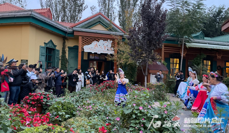 10月15日下午,參加第六屆世界媒體峰會(huì)的外媒代表在喀贊其民俗旅游區(qū)拍照留念。石榴云/新疆日?qǐng)?bào)記者 郭玲 攝