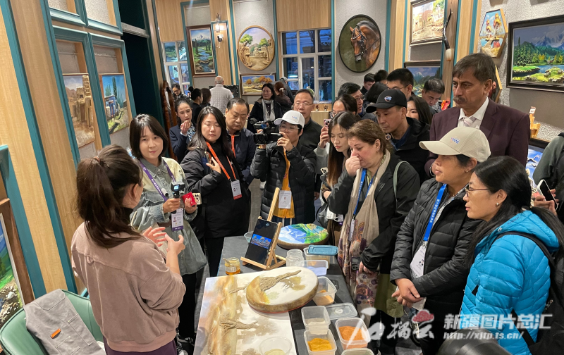 10月15日下午,參加第六屆世界媒體峰會(huì)的外媒代表聽(tīng)沙石畫(huà)的“故事”。石榴云/新疆日?qǐng)?bào)記者 郭玲 攝