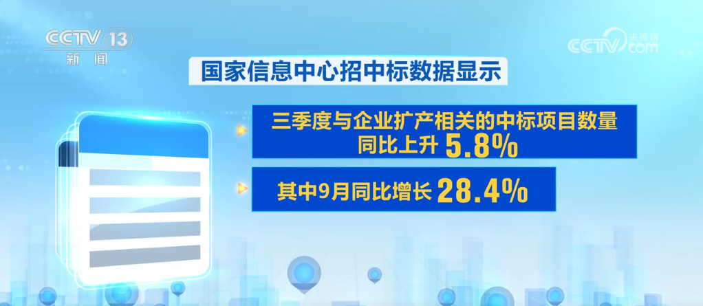 不僅工程建設在提速,作為項目落地的第一步,中標數據也在快速增長。國家信息中心招中標數據顯示,三季度與企業(yè)擴產相關的中標項目數量同比上升5.8%,其中9月同比增長28.4%,為今年以來最高增速,企業(yè)擴產熱度回升明顯。