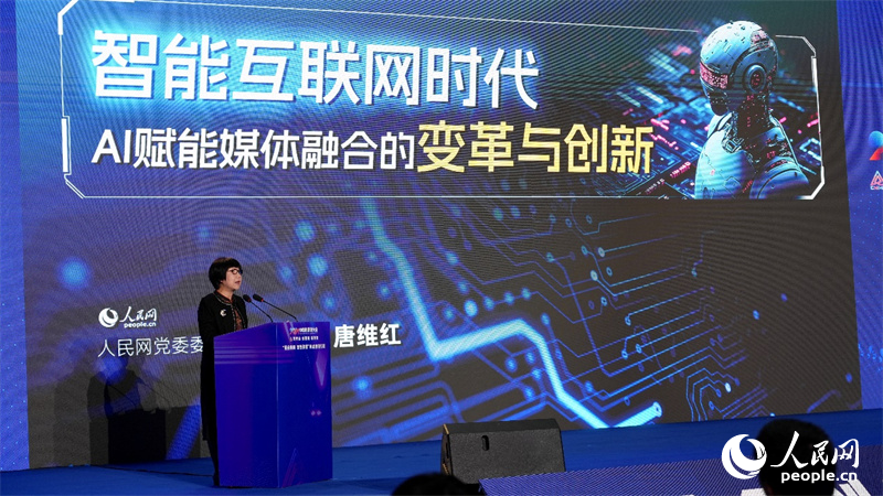 人民網(wǎng)監(jiān)事會主席、研究院院長唐維紅發(fā)表題為《智能互聯(lián)網(wǎng)時代AI賦能媒體融合的變革與創(chuàng)新》的主題報告。人民網(wǎng)記者 吳茜薇攝