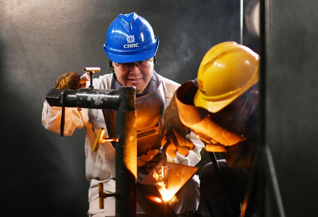 2024年2月4日,中車(chē)齊齊哈爾車(chē)輛有限公司貨車(chē)分廠電焊高級(jí)技師、高級(jí)工程師王海(左)指導(dǎo)徒弟焊接試件。新華社記者 王建威 攝