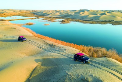 游客在尉犁縣羅布人村寨體驗沙漠越野。汪志鵬攝