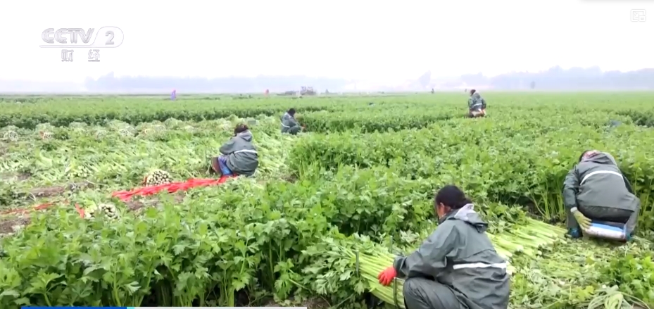 在山東德州齊河縣后王村,清新翠綠的芹菜挺拔脆嫩,種植戶(hù)正忙著收割、分揀、打捆、裝車(chē)。