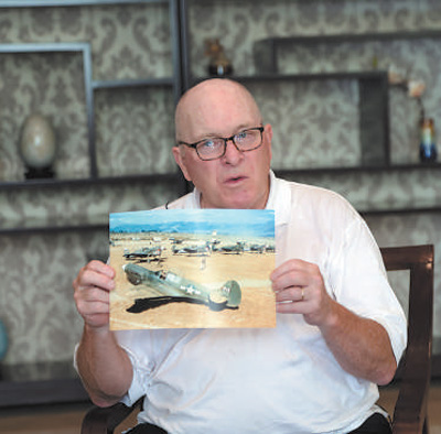 小克利福德·隆展示其父親曾駕駛的戰(zhàn)斗機照片。