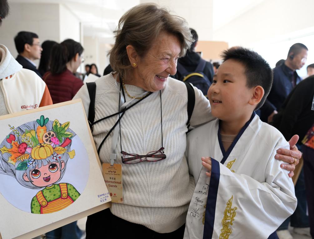 11月5日,外賓在河南省安陽市殷墟博物館與一名小朋友交流。新華社記者 李嘉南 攝