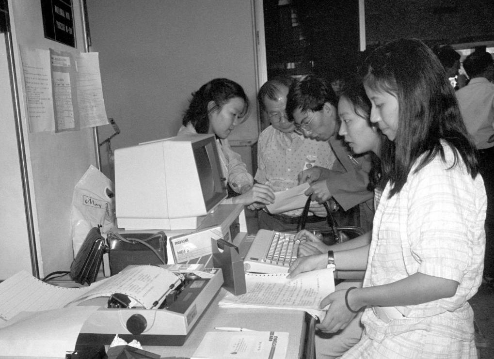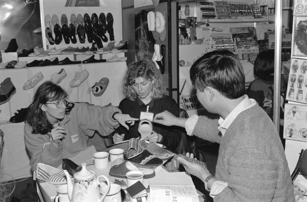 1991年3月,在上海舉行的首屆華東出口商品交易會(huì)(后發(fā)展為華東進(jìn)出口商品交易會(huì),簡(jiǎn)稱(chēng)“華交會(huì)”)上,兩名意大利客商同浙江省輕工業(yè)品進(jìn)出口公司代表洽談業(yè)務(wù)。新華社記者 柳中央 攝