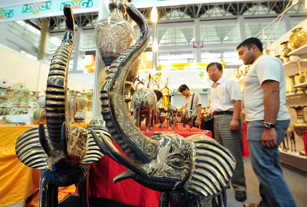 2013年9月15日,在寧夏銀川舉行的首屆中國(guó)-阿拉伯國(guó)家博覽會(huì)上,觀(guān)展者咨詢(xún)選購(gòu)巴基斯坦展區(qū)的特色展品黃銅雕塑。