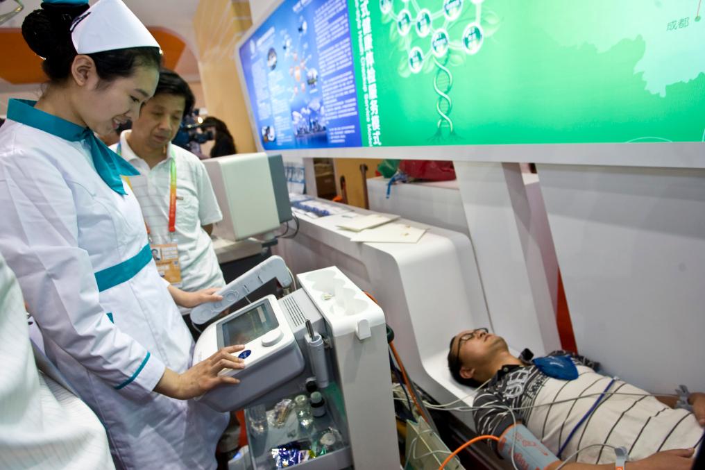 2012年5月28日,觀(guān)眾在首屆中國(guó)(北京)國(guó)際服務(wù)貿(mào)易交易會(huì)(簡(jiǎn)稱(chēng)“京交會(huì)”,后發(fā)展為中國(guó)國(guó)際服務(wù)貿(mào)易交易會(huì),即“服貿(mào)會(huì)”)體驗(yàn)全方位健康體檢。新華社發(fā)(趙冰 攝)