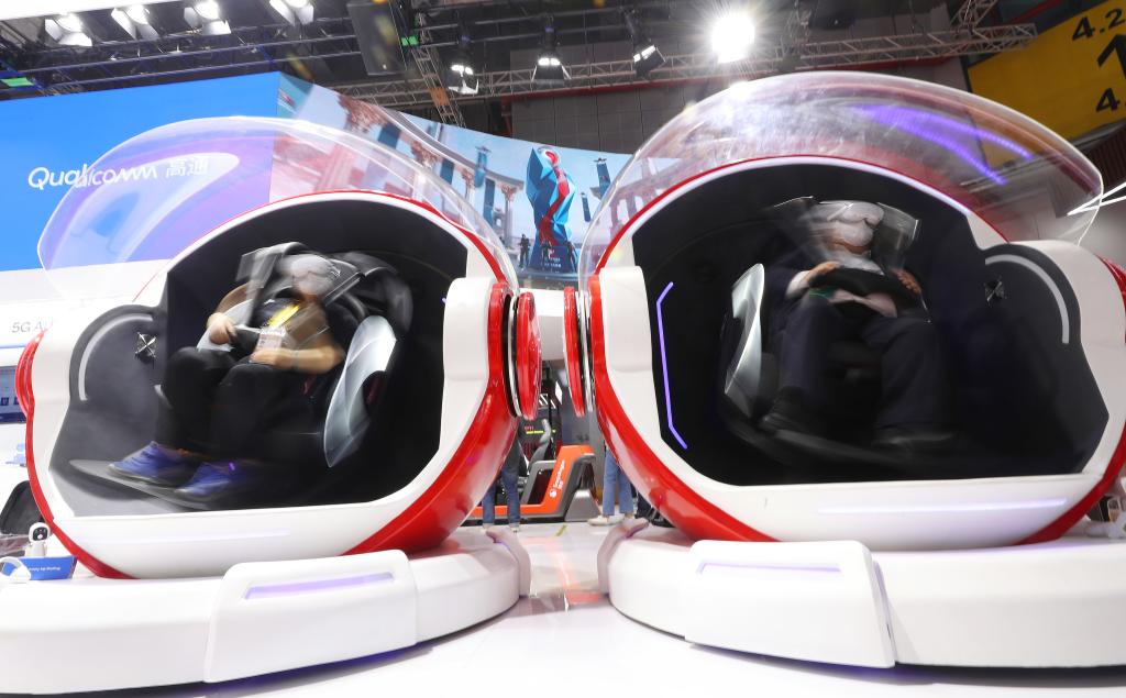 2022年11月5日,參觀(guān)者在第五屆進(jìn)博會(huì)技術(shù)裝備展區(qū)體驗(yàn)一款VR游戲座椅。新華社記者 方喆 攝