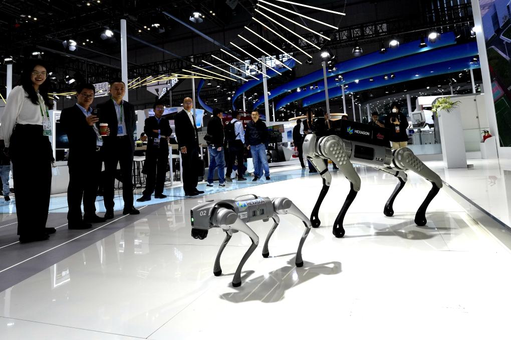 2023年11月7日,觀(guān)眾在第六屆進(jìn)博會(huì)技術(shù)裝備展區(qū)觀(guān)看智能機(jī)器狗。新華社記者 張建松 攝