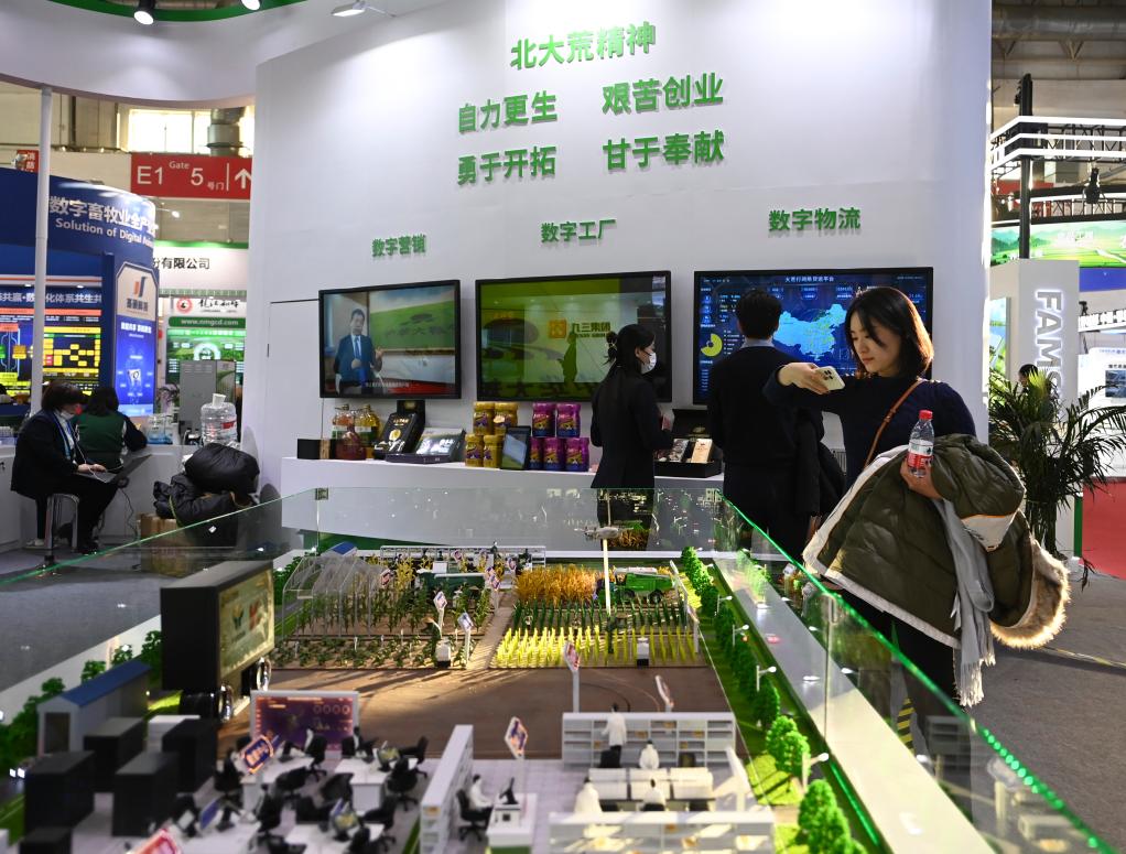 2023年11月30日,參觀(guān)者在首屆中國(guó)國(guó)際供應(yīng)鏈促進(jìn)博覽會(huì)(簡(jiǎn)稱(chēng)“鏈博會(huì)”)綠色農(nóng)業(yè)鏈展區(qū)北大荒集團(tuán)展臺(tái)前觀(guān)看智慧育種解決方案。新華社記者 蔡湘鑫 攝