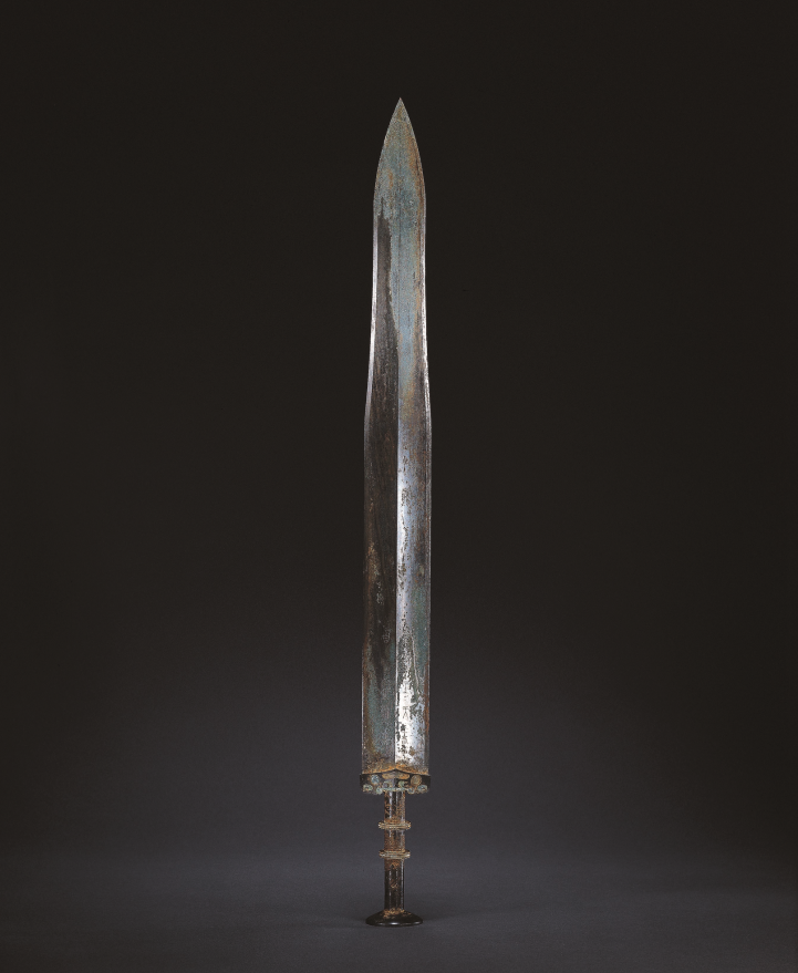 這柄吳王夫差劍體現(xiàn)了吳越青銅劍的最高制作工藝。首先,劍身和劍刃分兩次鑄成,劍身高銅低錫,韌性好不易折斷;劍刃高錫低銅,硬度高非常鋒利,復(fù)合鑄造使其剛?cè)嵯酀葓皂g又銳利。其次劍首有7層同心圓,其厚度最薄的只有0.2毫米左右,遠薄于現(xiàn)代鑄造業(yè)規(guī)定青銅鑄件的壁厚不小于3毫米的標準。這些同心圓在鑄造時,銅汁既要能排出空氣,均勻流動在比紙還薄的空間內(nèi),冷卻時又不因熱脹冷縮而出現(xiàn)裂縫,實在是令人嘆為觀止。