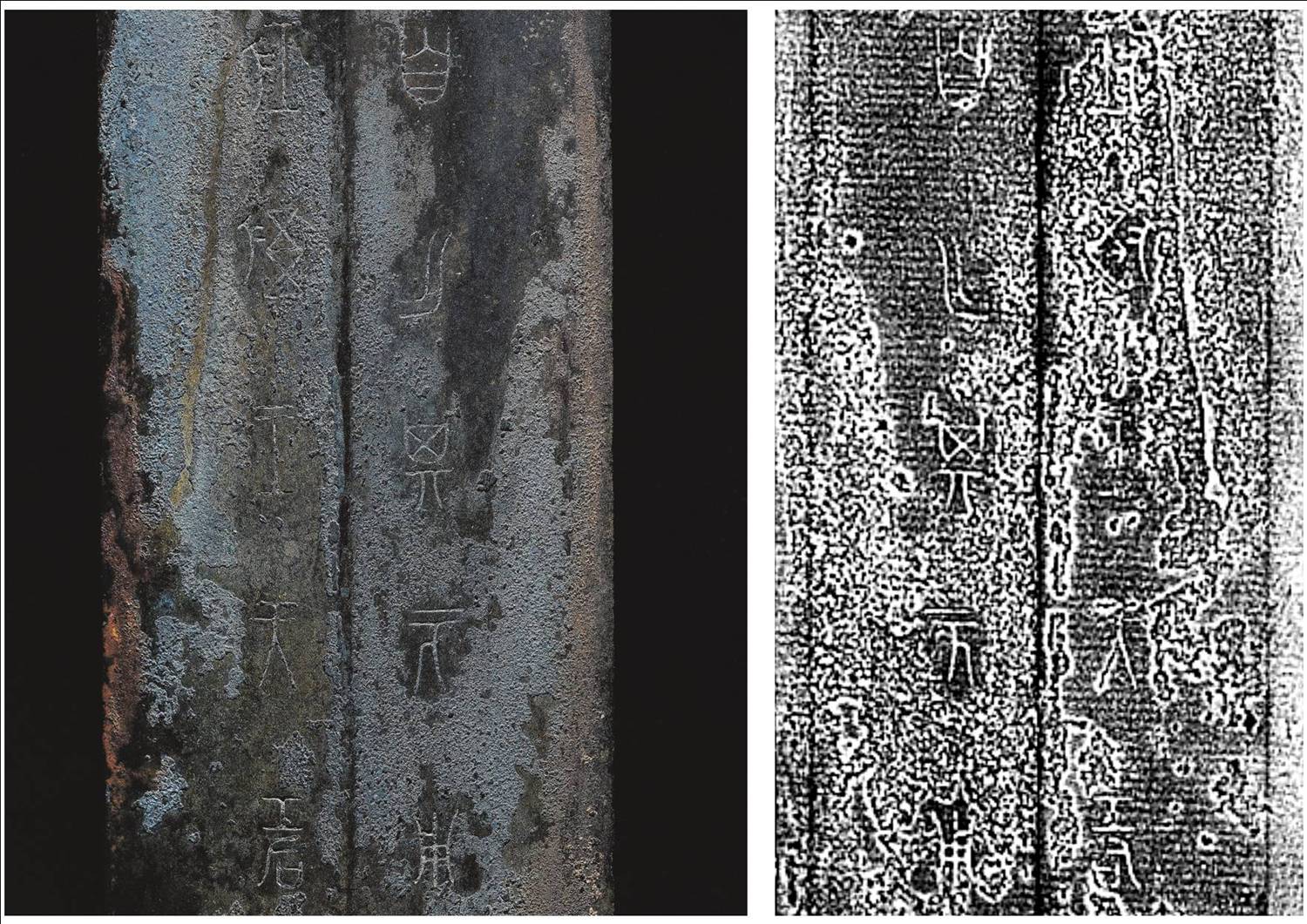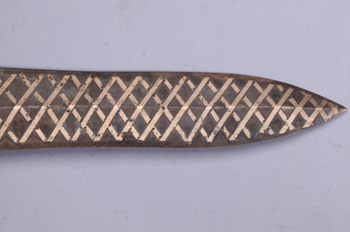 這把青銅劍通長58.3厘米,劍身寬大厚重,在前部有一個明顯變窄,可以提高劍的刺穿能力,劍尖雖然只有極尖銳的一點,但不可思議的是,在高倍放大鏡下仍然可以看出有六至八個截面。劍身雖然光素,仔細觀察會發(fā)現(xiàn)寶劍通體泛著幽幽的神秘藍光,劍格上鑄出獸面紋,鑲嵌的綠松石有一面已經(jīng)脫落,劍身近格處鑄有兩行銘文:“攻敔(吳)王夫差自乍(作)其元用”,表明這把劍的擁有者是吳國歷史上大名鼎鼎的吳王夫差。