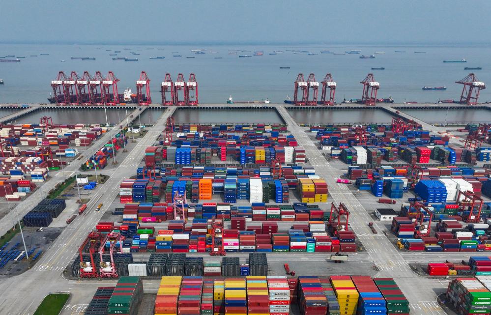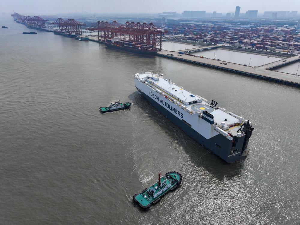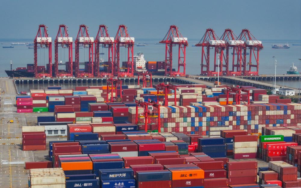 一艘貨輪駛離江蘇省蘇州港太倉港區(qū)集裝箱碼頭(無人機(jī)照片,10月10日攝)。新華社記者 李博 攝