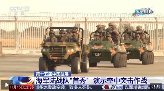 第十五屆中國航展是海軍陸戰(zhàn)隊員首次參加,除了演示艦載直升機(jī)飛行課目,還有搭載全地形山貓突擊車及多名陸戰(zhàn)隊員進(jìn)行快速突擊,奪控敵目標(biāo)的課目。